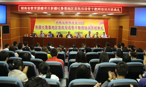 本网讯(学通社周瑶瑶 喻帅明 摄影竟攸)9月25日上午,湖南省教育援疆项目新疆吐鲁番地区首批双语骨干教师培训班开班典礼在我校张家界校区多功能报告厅举行。湖南省教育厅副巡视员廖湘生,吐鲁番地区教育工委书记、教育局党组书记陈文新,张家界市政府副市长刘曙华,我校副校长李宗范等出席了开班典礼。典礼由省教育厅民族教育处处长王玲主持。